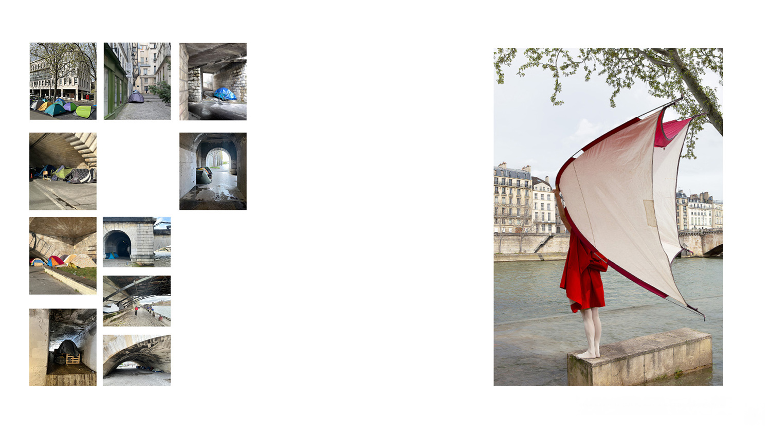 From the first day I arrived at the Cité internationale des Arts, tents belonging to homeless people caught my eye. Since the pandemic, the number of these shelters has increased in major cities around the world. In Paris, they are mainly home to migrants from former colonies awaiting the outcome of their asylum applications. In the context of the uniform cityscape that Baron Haussmann had built a century after the French Revolution, I explored their significance as social sculpture in the sense defined by Joseph Beuys. Demarcation, both spatial and visual as well as social. Intimacy?! Refuge. Mobile dwel-ling. Survival in nature. In the big city, I missed the connection to nature. In the colonial heritage, I discovered my own motif of longing and question our current idea of romance in an every time noicy city.