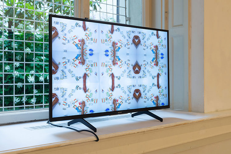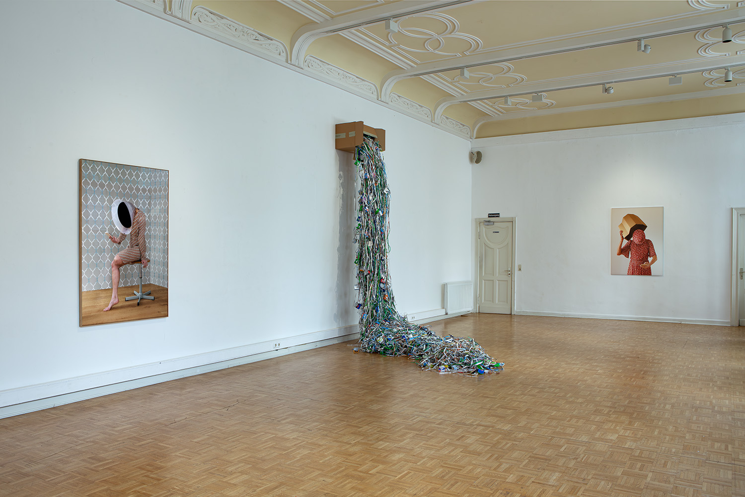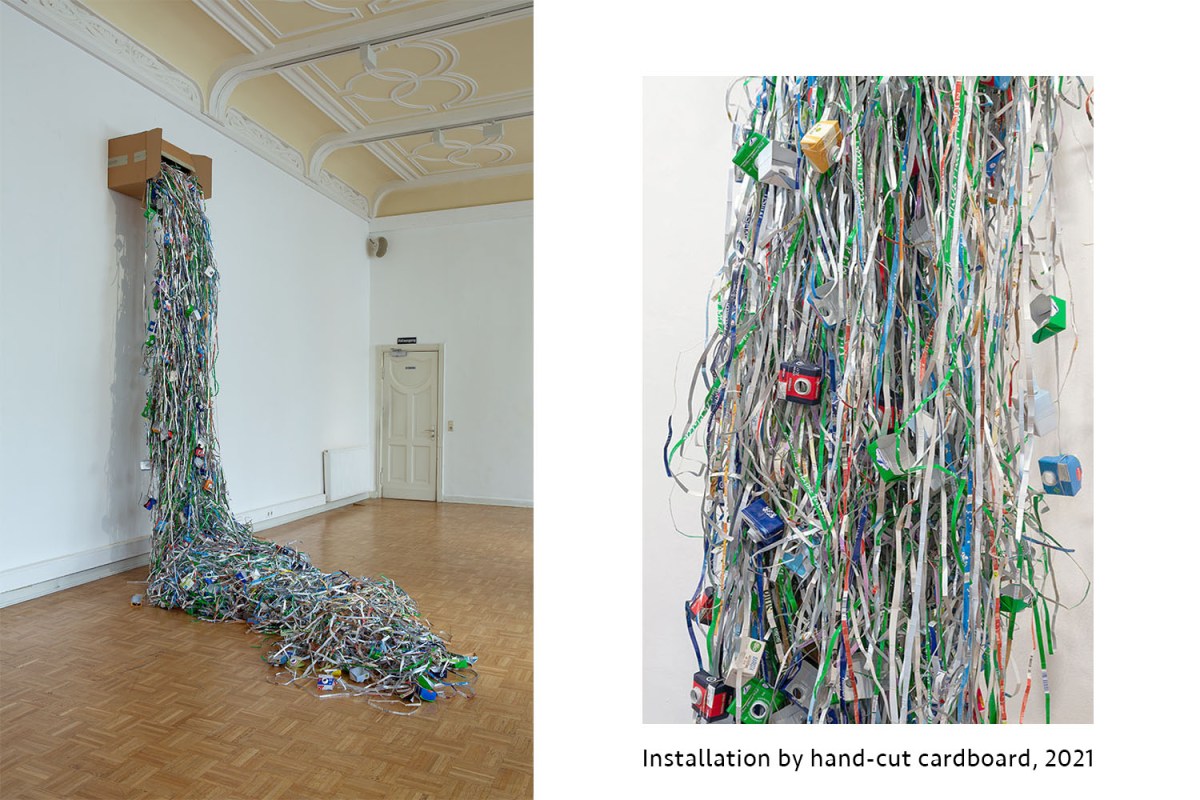 … Ich empfinde ein weißes Papier in seiner Reinheit und Leere als vollkommen. Es bildet den größtmöglichen Gegensatz zu unserer visuell überladenen Welt. Mit künstlerischer Absicht kann ich dem reinen Blatt Papier, oder eben auch dem Karton, keinen Strich zufügen. Ich benutzte farbigen Papiermüll als Ausdrucksmittel. Mit dieser Arbeitsweise knüpfe ich an frühere Arbeiten mit Abfallprodukten an. Für shifted, habe ich Turnhallenboden benutzt. Erinnerung an die Gegenwart ist eine Videoperformance, für die ich gebrauchte Fahrscheine benutzte. Das Video sollte bei der Luminale in Frankfurt gezeigt werden. Die Ausstellung wurde im April 2020 kurz vor Eröffnung aufgrund der Corona Bestimmungen abgesagt… nun ist sie hier bei euch zu sehen. Die Tetrapacks habe ich mit Hilfe zahlreicher Unterstützer während der Pandemie gesammelt und geschnitten. Hier im Bellevue Saal konnte ich die Installation, die du vorhin „Wasserfall“ nanntest, zu ersten Mal zeigen. Dafür danke ich euch sehr. Und dir für die Interpretation als Wasserfall :)